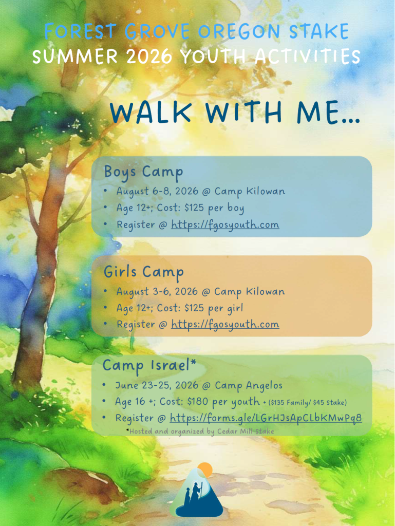 This website’s intended use is for parents and youth of the Forest Grove Oregon Stake. It is not an official or supported website of the Church of Jesus Christ of Latter-day Saints.